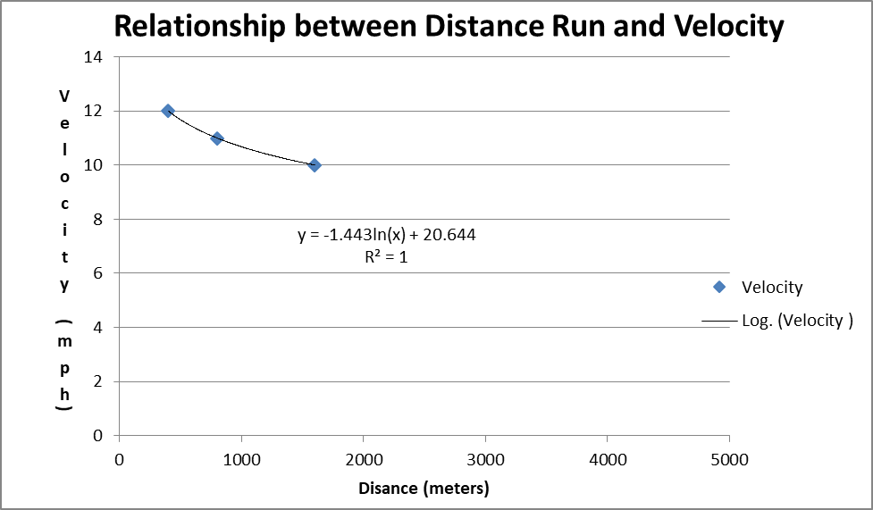 In this athlete who ran 400 meters in 1:15 (12 mph) and 800 meters in 2:43 (10.99 mph) he would be predicted to run 1600 meters in 6:00 (9.99 mph). To determine his 5000 meter pace (or any longer distance pace) we would then just use the log function and insert the distance as x to get the mph as Y.